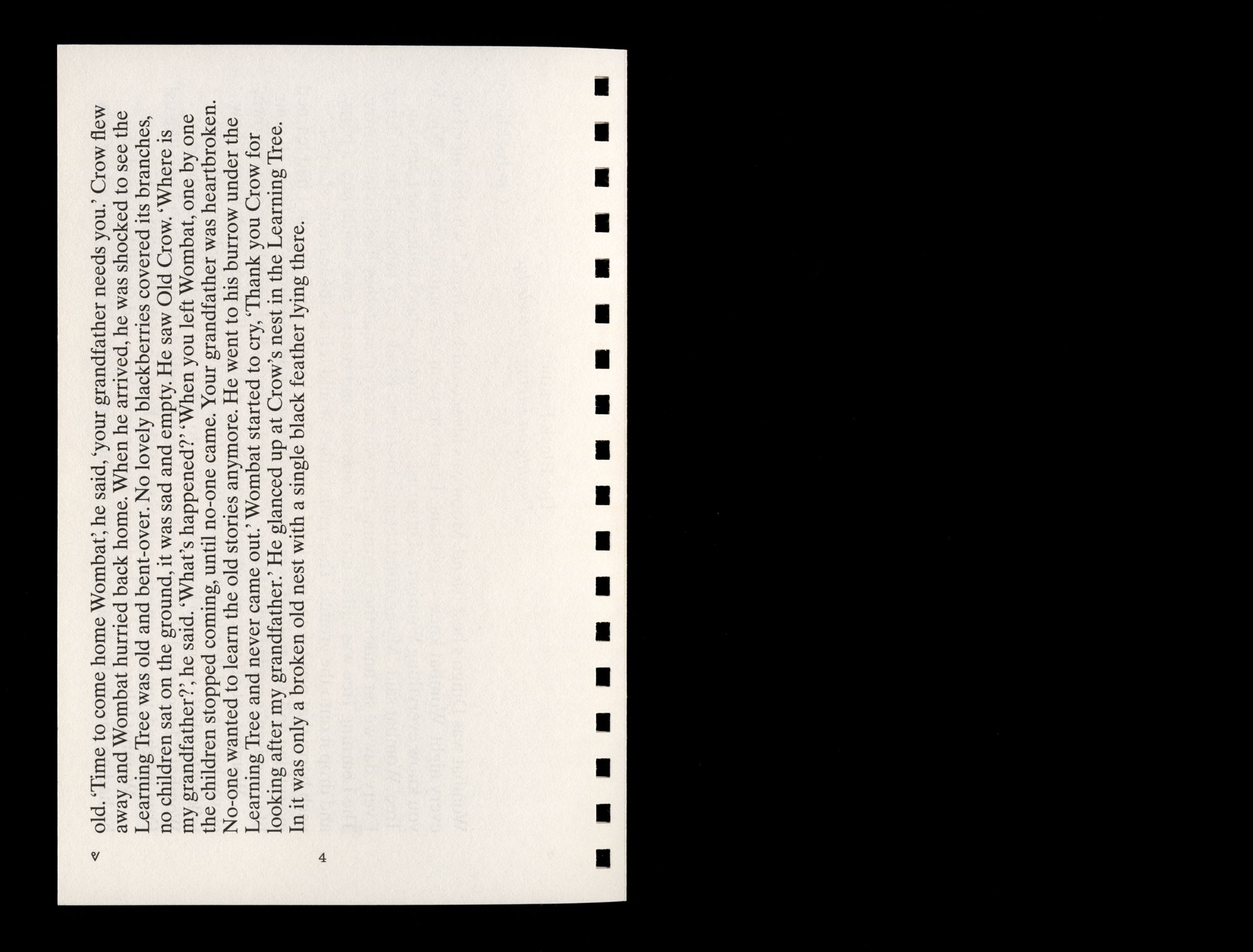 Wombat felt so tired, he had been away a long-time, and for all his knowledge, he had no friends. He heard someone call his name. It was Black Crow, looking very old. ‘Time to come home Wombat’, he said, ‘your grandfather needs you.’ Crow flew away and Wombat hurried back home. When he arrived, he was shocked to see the Learning Tree was old and bent-over. No lovely blackberries covered its branches, no children sat on the ground, it was sad and empty. He saw Old Crow. ‘Where is my grandfather?’, he said. ‘What’s happened?’ ‘When you left Wombat, one by one the children stopped coming, until no-one came. Your grandfather was heartbroken. No-one wanted to learn the old stories anymore. He went to his burrow under the Learning Tree and never came out.’ Wombat started to cry, ‘Thank you Crow for looking after my grandfather.’ He glanced up at Crow’s nest in the Learning Tree. In it was only a broken old nest with a single black feather lying there.