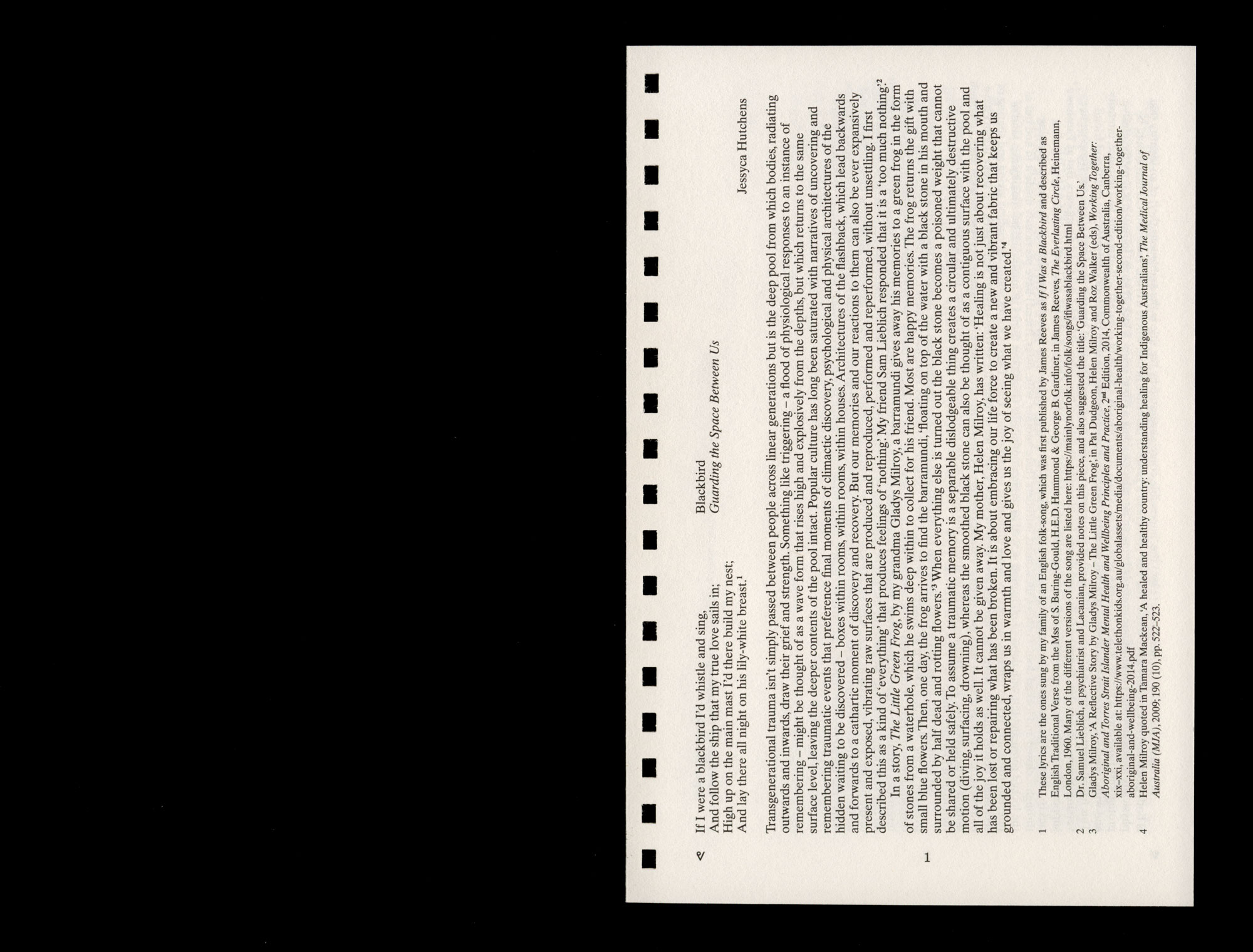 Gladys Milroy, ‘A Reflective Story by Gladys Milroy – The Little Green Frog’, in Pat Dudgeon, Helen Milroy and Roz Walker (eds), Working Together: Aboriginal and Torres Strait Islander Mental Health and Wellbeing Principles and Practice, 2nd Edition, 2014, Commonwealth of Australia, Canberra, xix–xxi, available at: https://www.telethonkids.org.au/globalassets/media/documents/aboriginal-health/working-together-second-edition/working-together-aboriginal-and-wellbeing-2014.pdf ↩