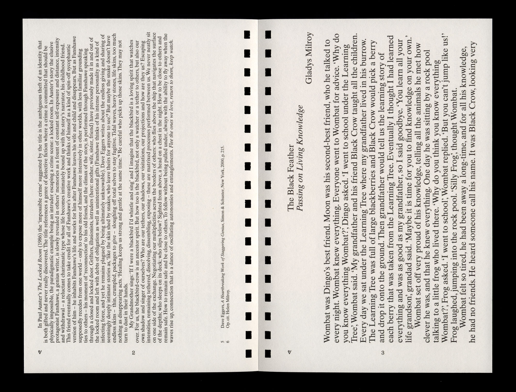 In Paul Auster’s The Locked Room (1986) the ‘impossible crime’ suggested by the title is the ambiguous theft of an identity that is both gifted and never really discovered. The title references a genre of detective fiction where a crime is committed that should be physically impossible, the paradigmatic example being an intruder escaping a crime scene: a locked room. In Auster’s story the elusive protagonist Fanshawe, a genius writer, is slowly revealed in others’ memories as a fount of constant self-exposure and distance, intensity and withdrawal – a reluctant charismatic type whose life becomes intimately bound up with the story’s narrator, his childhood friend. This friend eventually comes to take credit for all of Fanshawe’s creative work and thinks of himself as a kind of spin-off sycophantic version of him – he inhabits Fanshawe’s life and works for him after Fanshawe leaves his wife and child and disappears. But as Fanshawe supposedly recedes from one world – only to expose more of himself more intensively in other worlds, with less familiar grounding ties to others – his moment of ‘reconnection’ to his old friend, and the climax of the story, is performed through Fanshawe speaking through a closed and locked door. Grifters, illusionists, intruders (here: mother, wife, sister, friend) have previously made it in and out of the locked room and left with debts of obligation as well as unintentional gifts (Fanshawe thinks of his intense personality as a kind of infecting force, and yet he remains plagued by being ultimately unknowable). Dave Eggers writes about the endless giving and sharing of seemingly deeply intimate stories as, ‘like the skin shed by snakes, who leave theirs for anyone to see’.4 But maybe the snake doesn’t have endless skins – thin, crumpled, packages to give – sloughing off total selves to stay fugitive. Tidal waves, heavy stones, life skins, too much nothing as disappearing acts. ‘Healing keeps us strong and gentle at the same time.’5 Be careful who picks up those skins. They may not turn to dust in their hands.
