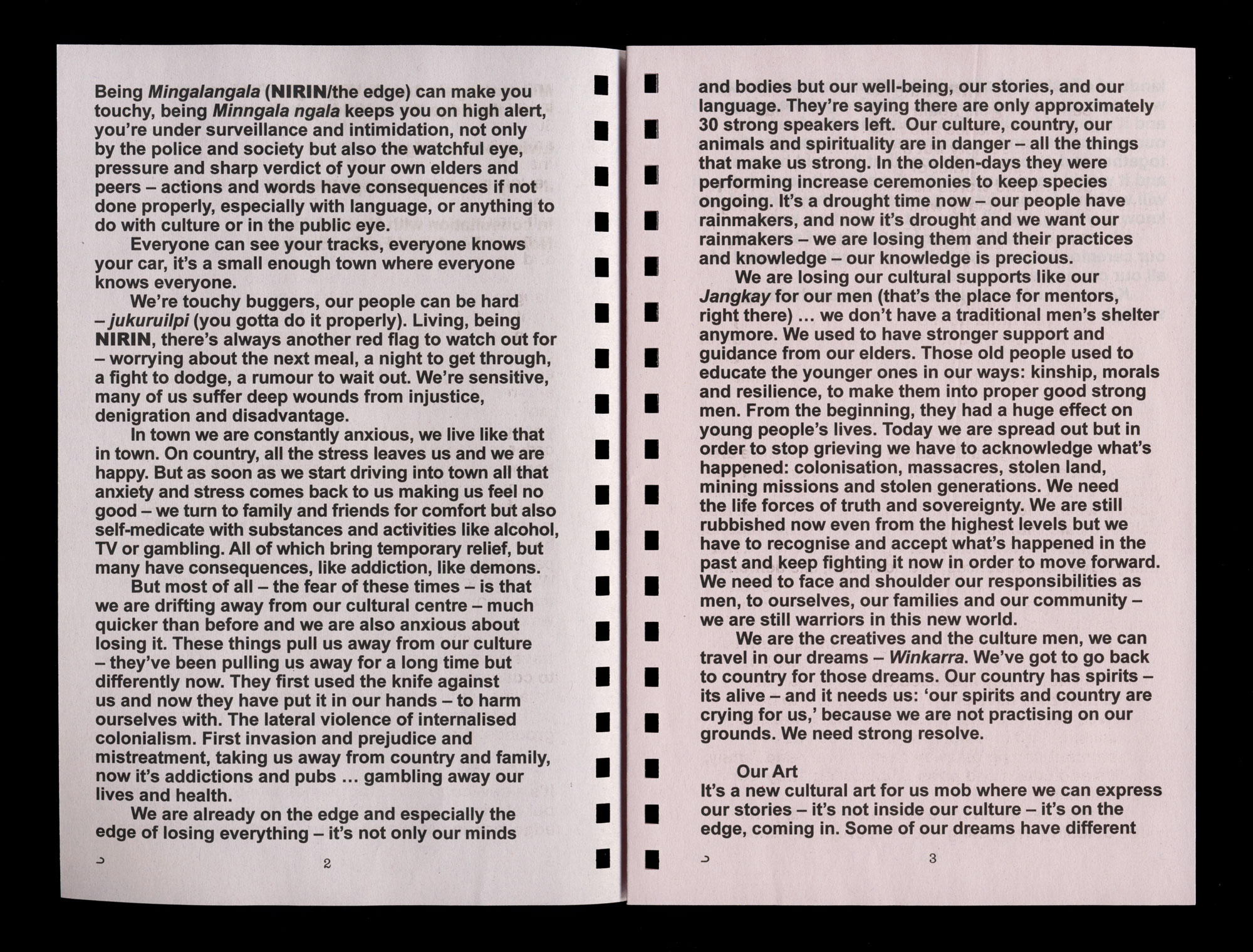 In a story, The Little Green Frog, by my grandma Gladys Milroy, a barramundi gives away his memories to a green frog in the form of stones from a waterhole, which he swims deep within to collect for his friend. Most are happy memories. The frog returns the gift with small blue flowers. Then, one day, the frog arrives to find the barramundi, ‘floating on top of the water with a black stone in his mouth and surrounded by half dead and rotting flowers.’2 When everything else is turned out the black stone becomes a poisoned weight that cannot be shared or held safely. To assume a traumatic memory is a separable dislodgeable thing creates a circular and ultimately destructive motion (diving, surfacing, drowning), whereas the smoothed black stone can also be thought of as a contiguous surface with the pool and all of the joy it holds as well. It cannot be given away. My mother, Helen Milroy, has written: ‘Healing is not just about recovering what has been lost or repairing what has been broken. It is about embracing our life force to create a new and vibrant fabric that keeps us grounded and connected, wraps us in warmth and love and gives us the joy of seeing what we have created.’3