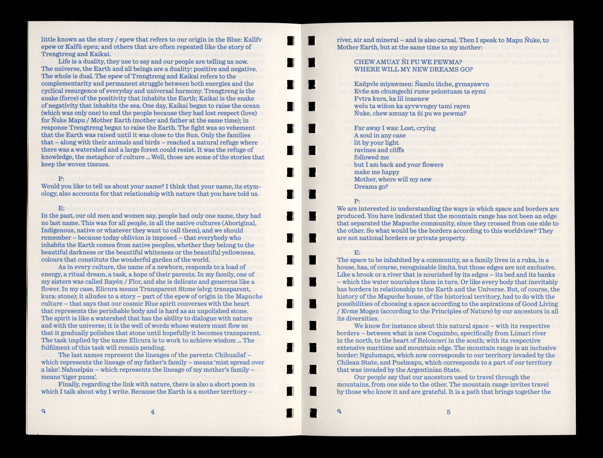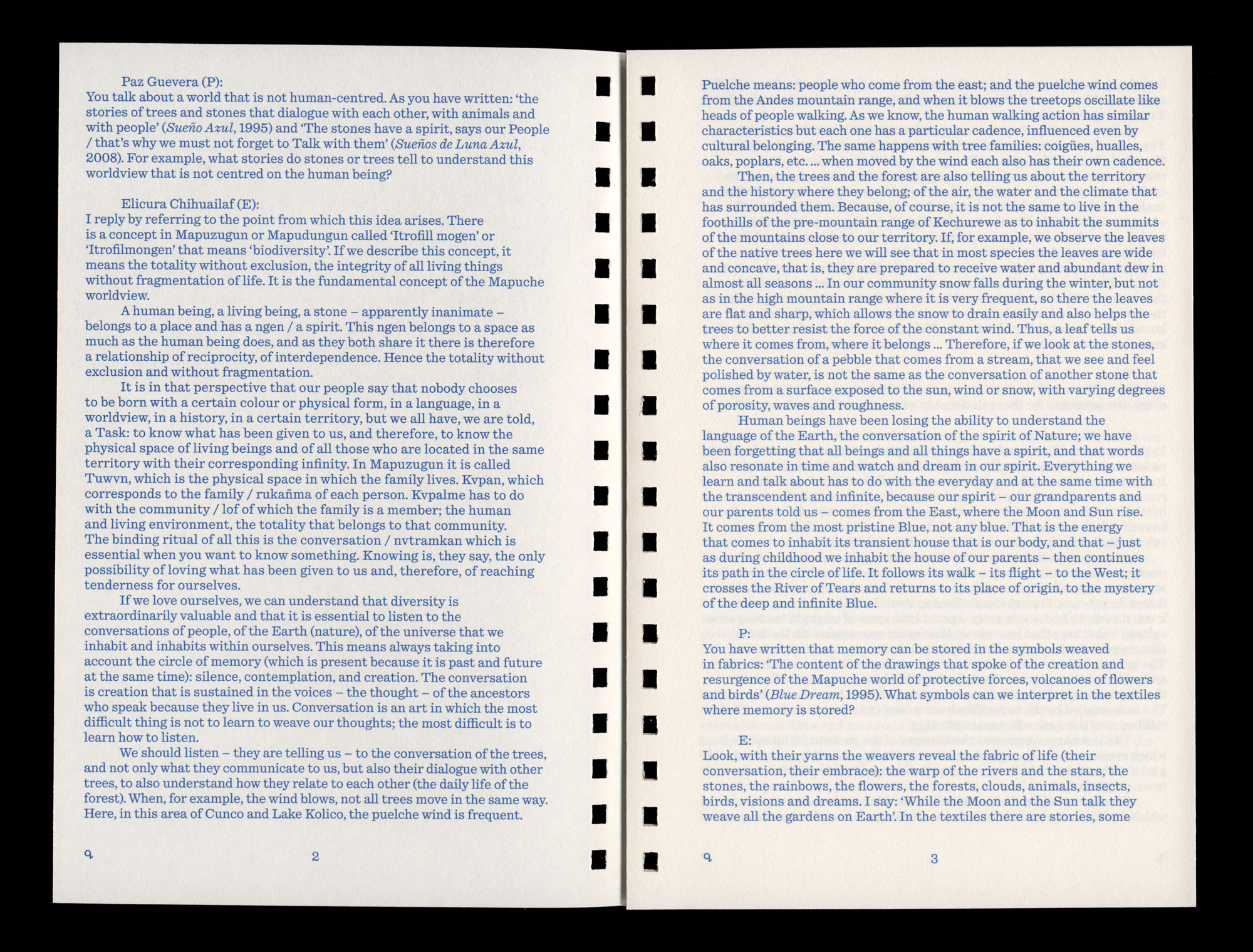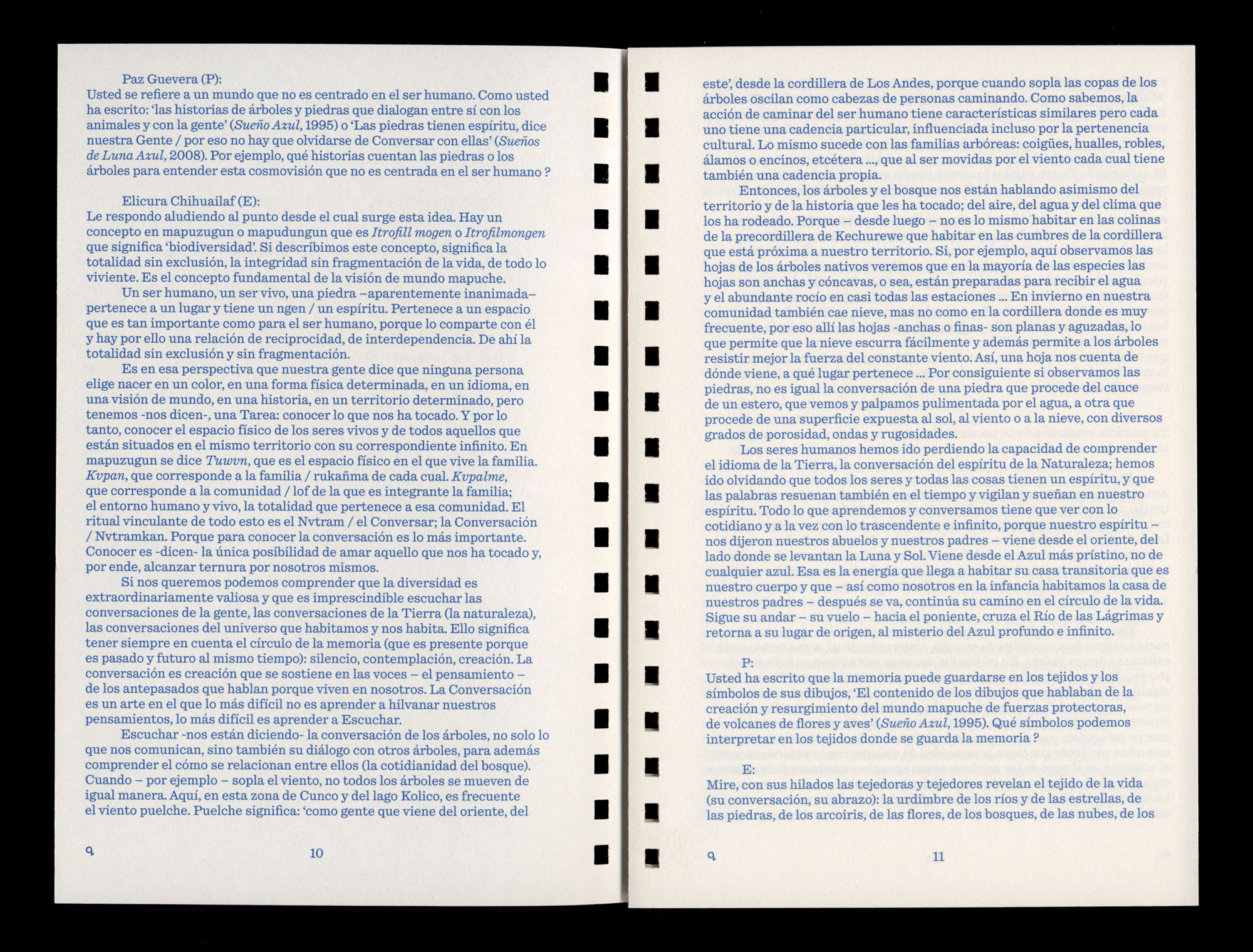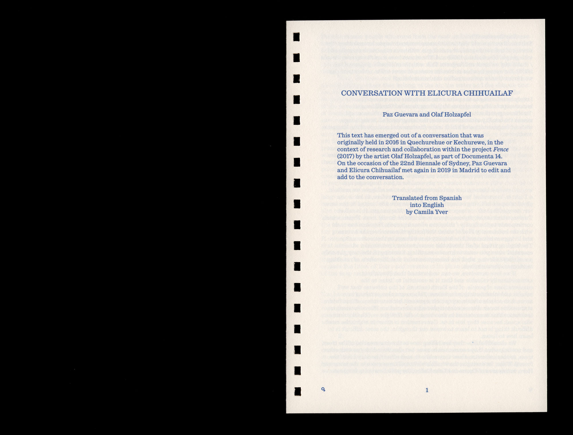 originally held in 2016 in Quechurehue or Kechurewe, in the context of research and collaboration within the project Fence (2017) by the artist Olaf Holzapfel, as part of Documenta 14. On the occasion of the 22nd Biennale of Sydney, Paz Guevara and Elicura Chihuailaf met again in 2019 in Madrid to edit and add to the conversation.