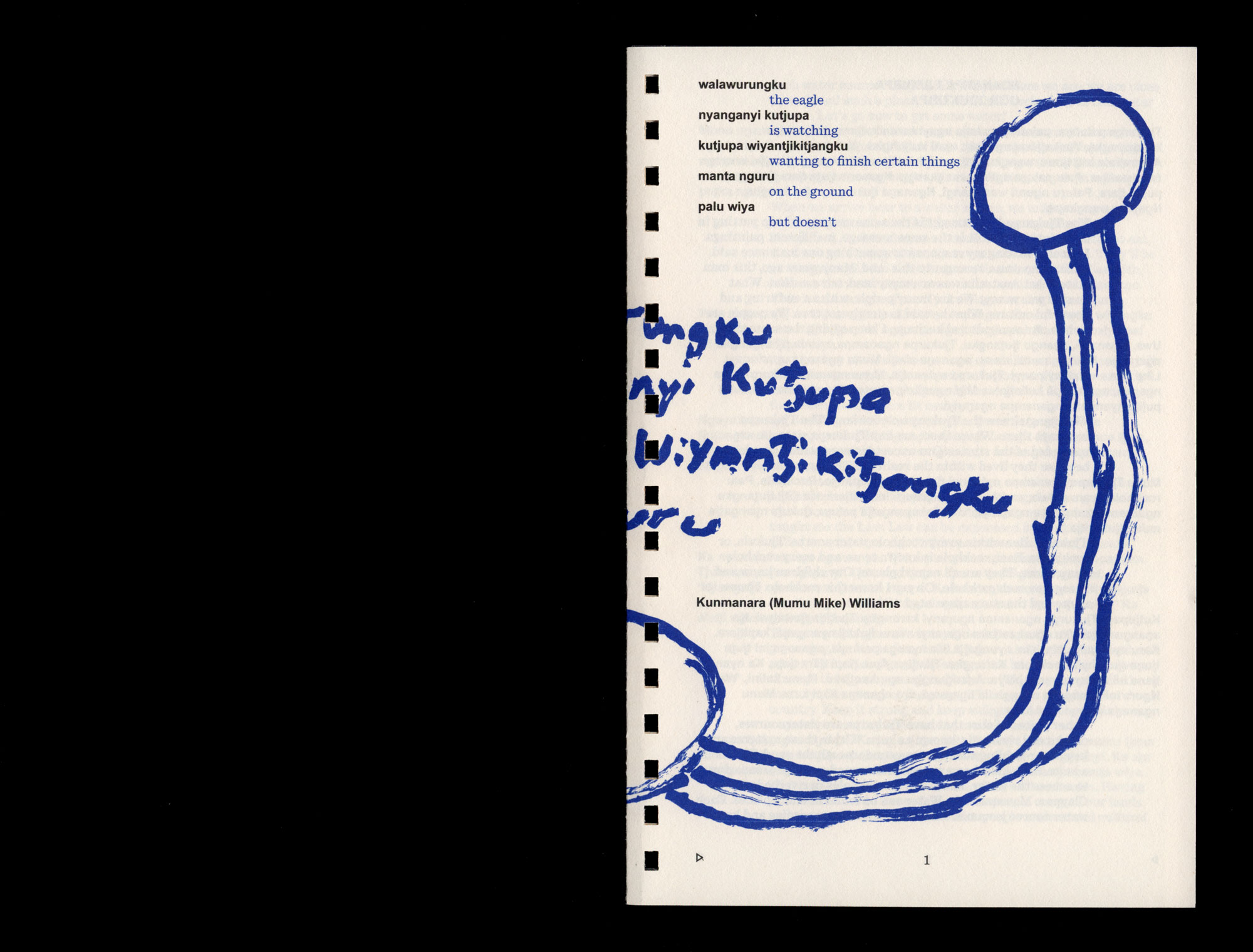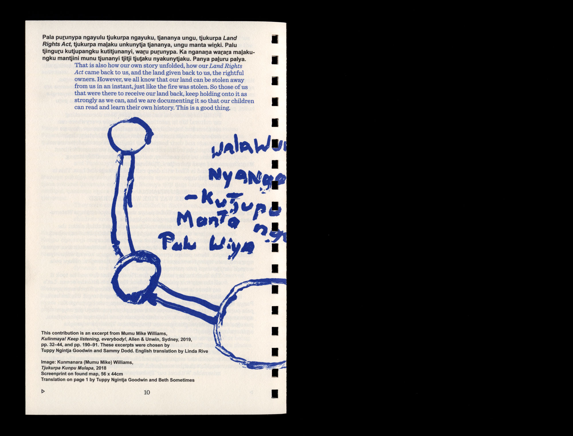 This contribution is an excerpt from Mumu Mike Williams, Kulinmaya! Keep listening, everybody!, Allen & Unwin, Sydney, 2019, pp. 32–44, and pp. 190–91. These excerpts were chosen by Tuppy Ngintja Goodwin and Sammy Dodd. English translation by Linda Rive