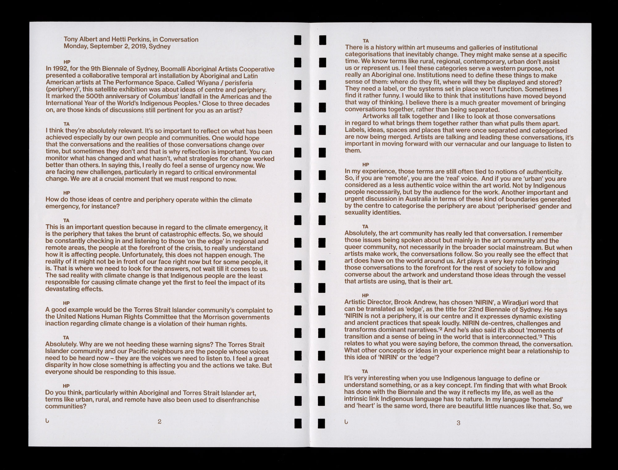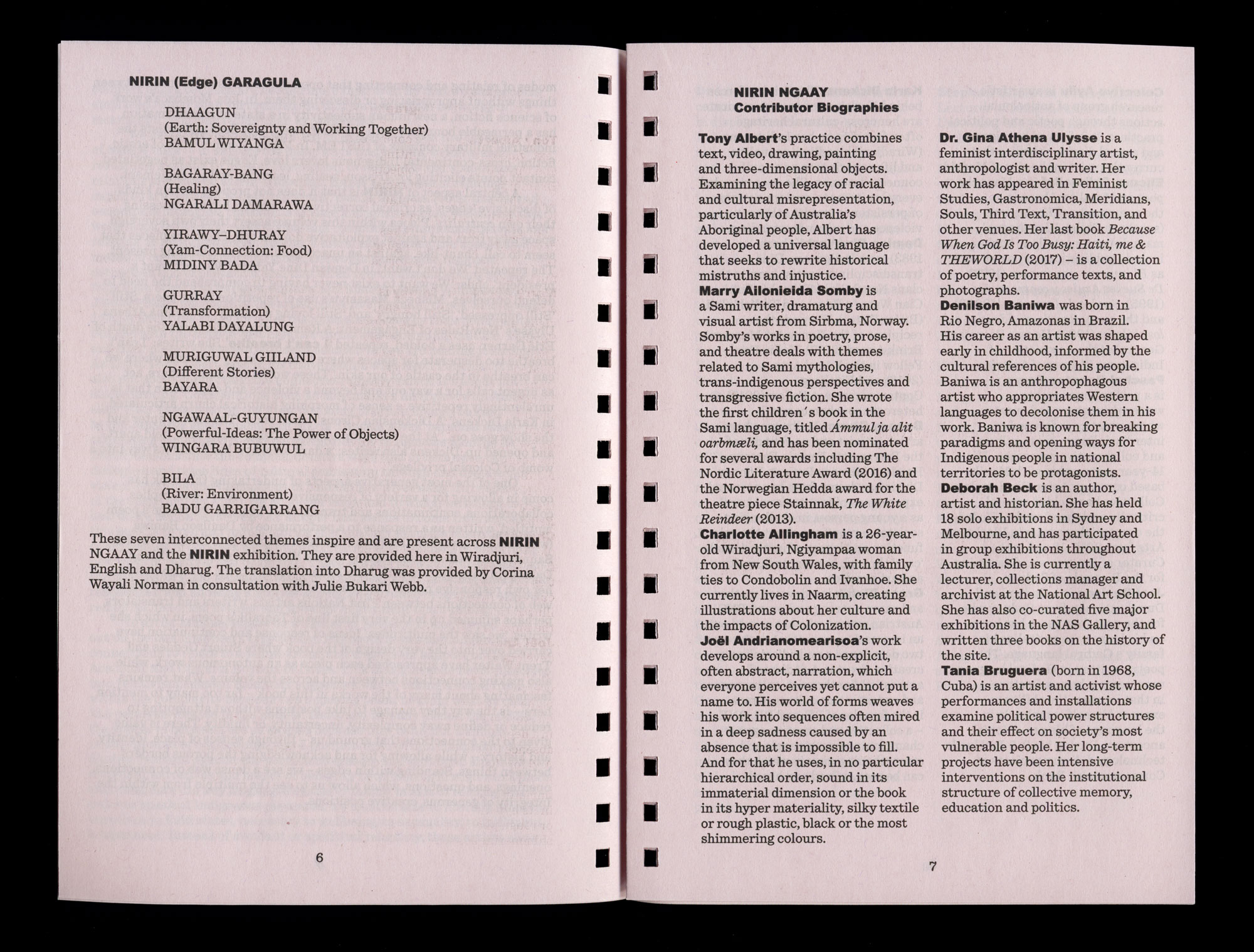 It’s very interesting when you use Indigenous language to define or understand something, or as a key concept. I’m finding that with what Brook has done with the Biennale and the way it reflects my life, as well as the intrinsic link Indigenous language has to nature. In my language ‘homeland’ and ‘heart’ is the same word, there are beautiful little nuances like that. So, we become much more attached to the world around us rather than as singular entities or individuals. I think that’s the idea; it’s not the actual periphery, it’s the centre, it’s the core of our being. And, I think that is, again, this common thread with Indigenous people, Indigenous language and the way in which we position ourselves in the world. It’s not a singular experience, it’s a group experience and that group includes what actually surrounds us ... what is living, and that is, theoretically, everything. So, NIRIN is a beautiful and important play on words.