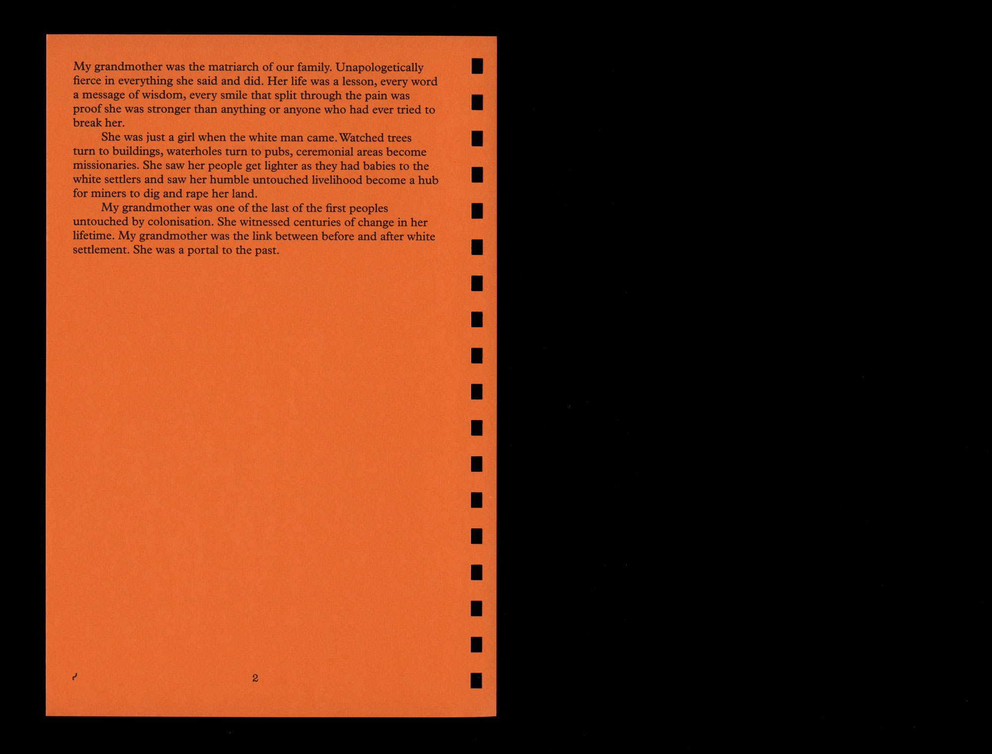 Wiyana / perisferia (periphery), 1992, was a collaborative temporal art installation by Aboriginal and Latin American artists curated by Hetti Perkins and Lilliana E. Correa for Boomalli Aboriginal Artists Co-operative at the Performance Space, Sydney, for the 9th Biennale of Sydney. ↩