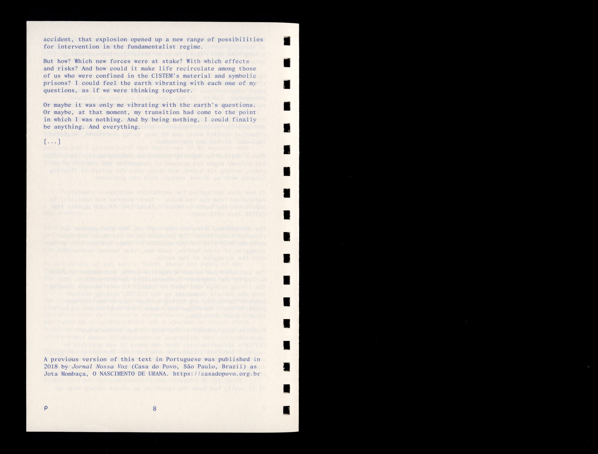 A previous version of this text in Portuguese was published in 2018 by Jornal Nossa Voz (Casa do Povo, São Paulo, Brazil) as Jota Mombaça, O NASCIMENTO DE URANA. https://casadopovo.org.br