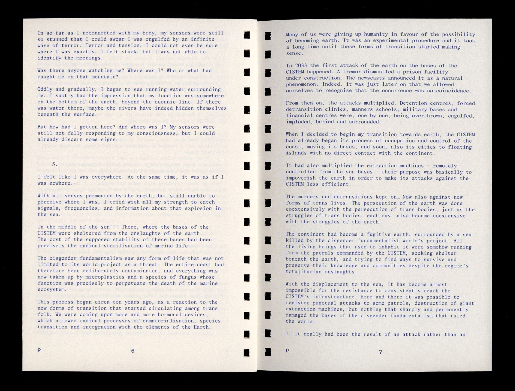 The continent had become a fugitive earth, surrounded by a sea killed by the cisgender fundamentalist world’s project. All the living beings that used to inhabit it were somehow running from the patrols commanded by the CISTEM, seeking shelter beneath the earth, and trying to find ways to survive and preserve their knowledge and communities despite the regime’s totalitarian onslaughts.