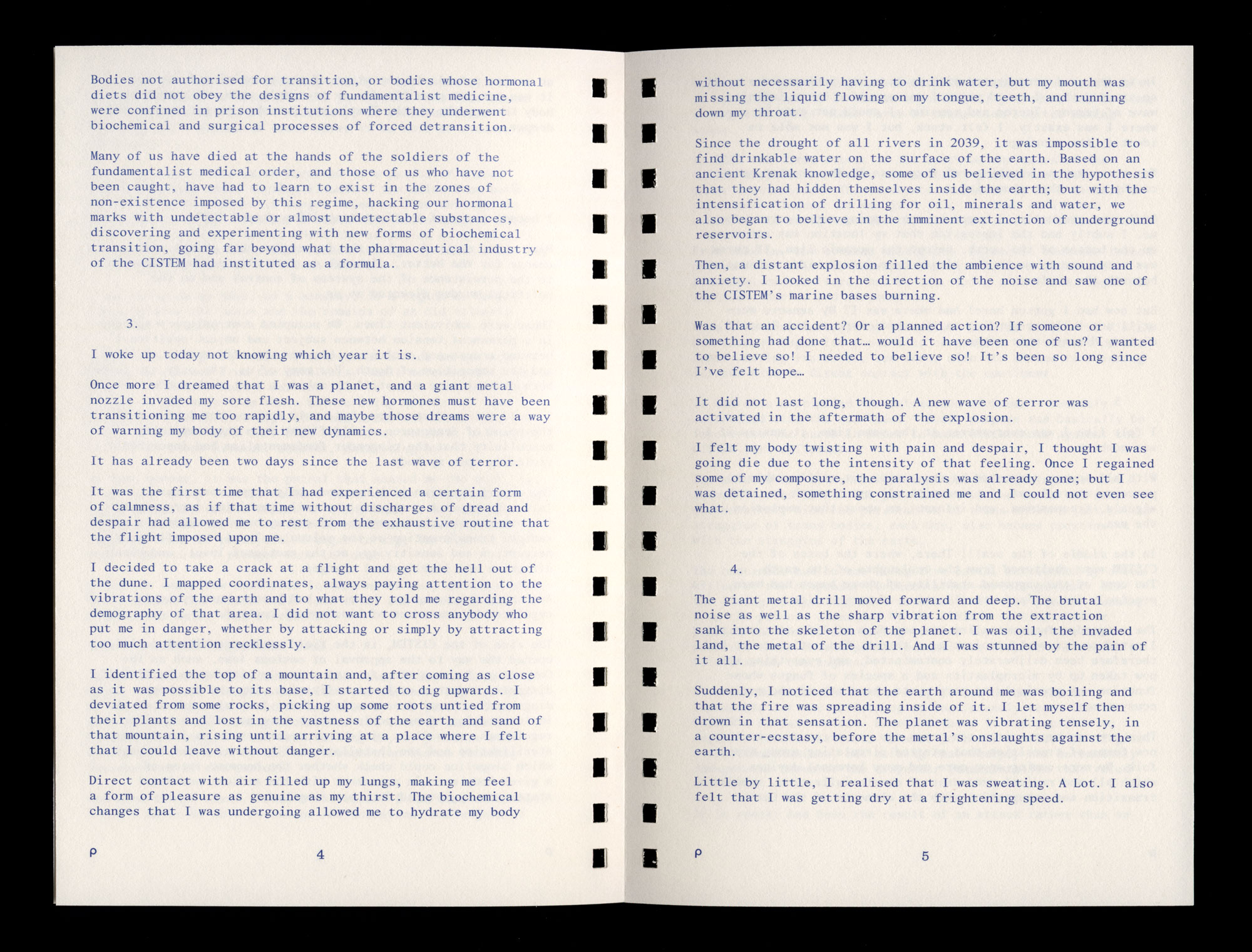 Bodies not authorised for transition, or bodies whose hormonal diets did not obey the designs of fundamentalist medicine, were confined in prison institutions where they underwent biochemical and surgical processes of forced detransition.