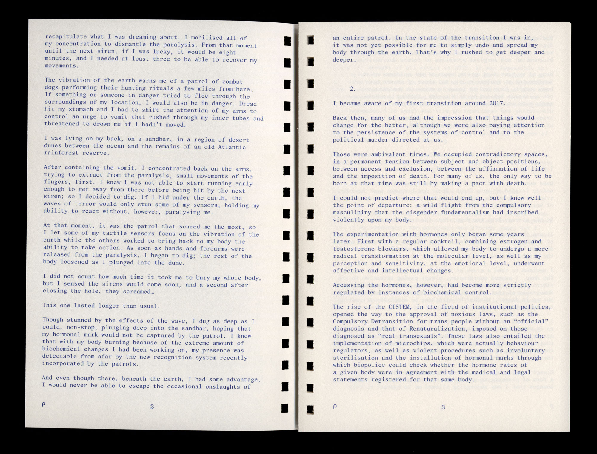 Many of us have died at the hands of the soldiers of the fundamentalist medical order, and those of us who have not been caught, have had to learn to exist in the zones of non-existence imposed by this regime, hacking our hormonal marks with undetectable or almost undetectable substances, discovering and experimenting with new forms of biochemical transition, going far beyond what the pharmaceutical industry of the CISTEM had instituted as a formula.