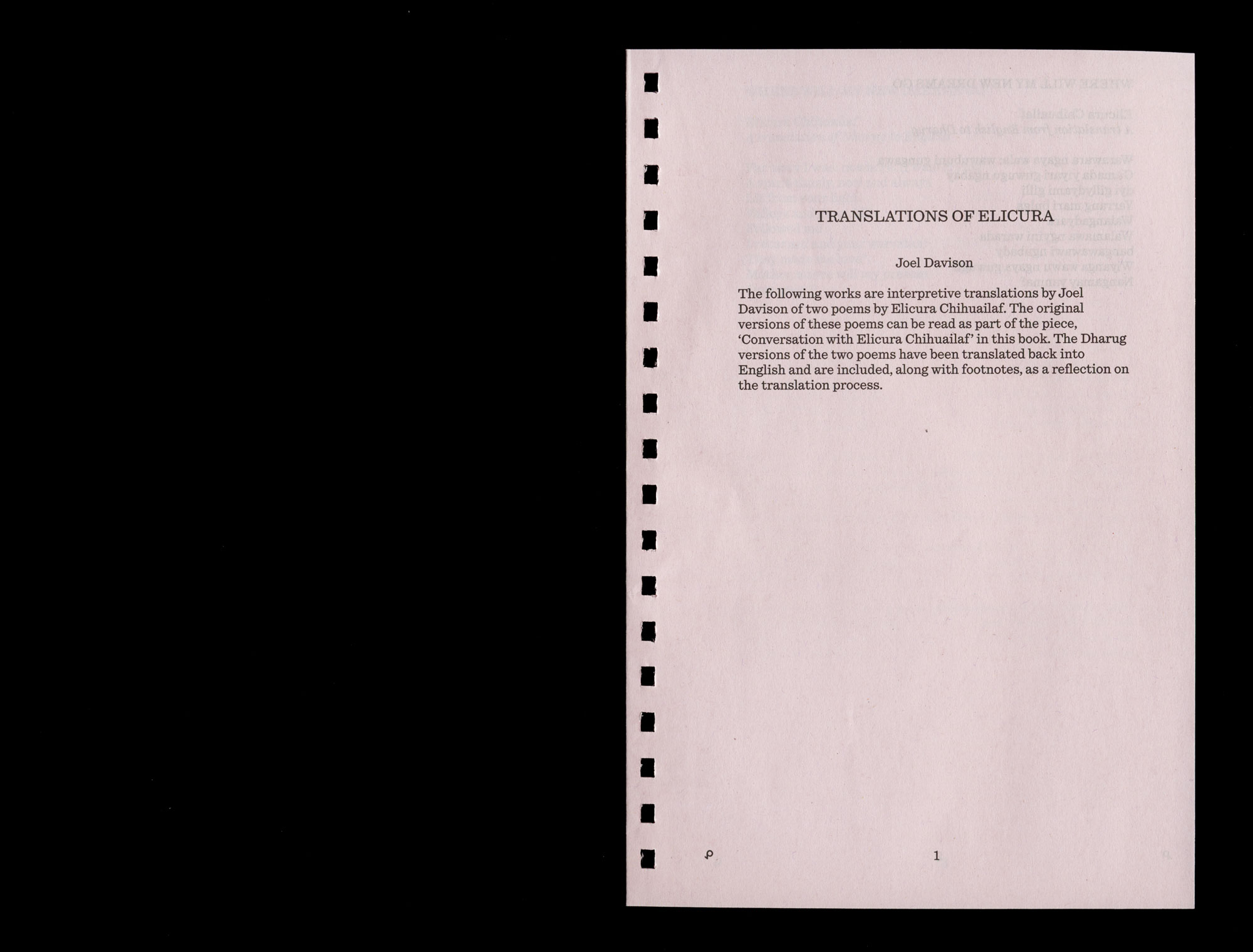The following works are interpretive translations by Joel Davison of two poems by Elicura Chihuailaf. The original versions of these poems can be read as part of the piece, ‘Conversation with Elicura Chihuailaf’ in this book. The Dharug versions of the two poems have been translated back into English and are included, along with footnotes, as a reflection on the translation process.
